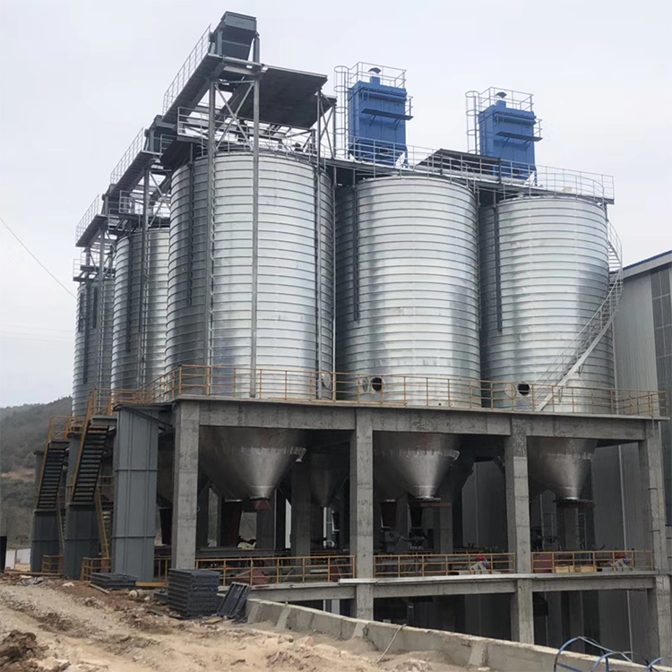 接收与清理设置在筒仓中央该形式筒仓一般采用对称排列,提升机井架固定,经过提升后的物料通过仓顶溜管进人筒仓。这种形式省去了仓顶输送设备和上通廊,从而节省了建造费用,缩短了建造工期。对于贮存时间要求较长的大型粮库,则应根据物料的流向、场地情况、工艺要求等合理地配置投料口、工作塔、烘干塔及恩施钢板仓的位置。国华钢板仓介绍了这几种常见的进料形式,实际中可将各种形式相互组合,相互渗透,根据实际情况合理搭配,灵活选用。